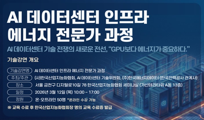 한국산업지능화협(이하 협회)가 AI 데이터센터 기술위원회, 한국에너지데이터와 공동으로 3월 12일(목), AI 데이터센터 구축과 운영에 수반되는 에너지 문제해결을 위한 전문교육을 실시한다.