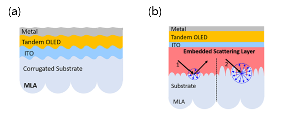 다음으로 제시된 방법은 광산란층이다. 소자 내부에 Waveguide 모드로 갇힌 빛을 산란시켜 공기 방향으로 방출시키는 역할을 한다. 그림 14와 같이 광산란층에는 기판 자체를 요철화 시키는 요철 기판(Corrugated substrate)와 유기층 내부 또는 ITO 근처에 산란층을 삽입하는 매립형 산란층(Embedded scattering layer)이 있다. 요철 기판은 구조가 단순하다는 장점이 있지만 유기물 증착시 평탄화되어 산란 효과가 감소해 탠덤 OLED에서는 효과가 제한적이다. 매립형 산란층의 경우에는 산란 효율이 높으며 평탄한 상부 구조 유지가 가능하고 산란층의 굴절률이 클수록 효과가 증가하지만, 동시에 흡수율도 증가하여 상충관계가 생긴다.