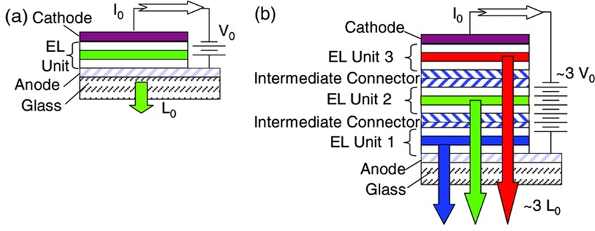 유기 발광 다이오드는 본질적으로 전류 구동형 소자로서, 전류 밀도를 증가시킬 경우 고휘도를 구현할 수 있다. 그러나 고전류 구동은 발광층 내 여기자 밀도 증가, 비방사성 소멸 과정의 활성화, 국부적인 발열 증가 등을 유발해 효율 롤오프와 소자 열화를 가속시킨다. 이는 기존 단일 구조 OLED(single-stack OLED)가 가지는 근본적인 한계로 지적되어 왔다.
