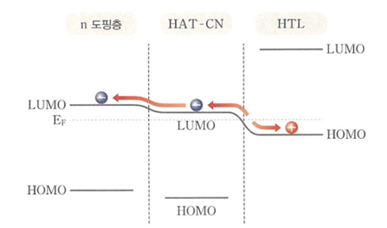 이 구조에서는 그림 7과 같이 정공 수송층의 HOMO가 강한 전자 수용성을 갖는 유기 물질, 즉 전자 받개 물질의 LUMO와 유사하다. 따라서 정공 수송층 물질의 전자가 전자 받개 물질로 이동하여 각각 정공과 전자가 생성된다. 금속 산화물 기반 전하생성층과 마찬가지로 전자 수송층으로서 n-doping 전자 수송층을 적용해야 전자 수송층으로의 전자 주입이 용이해진다.