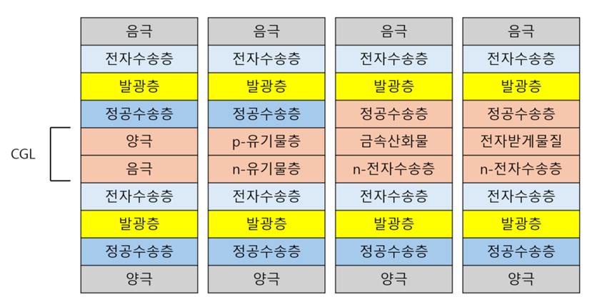 탠덤 OLED에서 전하생성층은 내부 전극처럼 작동하여 전자와 정공을 생성하고, 생성된 전하를 상·하 발광 유닛으로 공급한다. 초기에는 음극과 양극을 연결한 구조의 전하생성층 구조가 개발되었다. 이 구조는 투과율 확보를 위해 금속막을 얇게 형성해야 하는 동시에, 안정적인 전하 주입을 위해 일정 두께를 유지해야 하므로 설계가 어렵다. 또한 금속 전극의 높은 전도도로 인해 픽셀 간 전류 누설이 발생하여 인접 픽셀 간 간섭 문제가 나타나는 등 실제 적용에 한계가 있다. 따라서 이러한 한계를 극복하기 위해 제안된 유기 p-n 접합 기반, 금속 산화물 기반, 그리고 강한 전자 수용성을 갖는 유기 물질을 이용한 계면형 전하생성층 구조를 이어서 살펴보고자 한다(그림 4 참조).